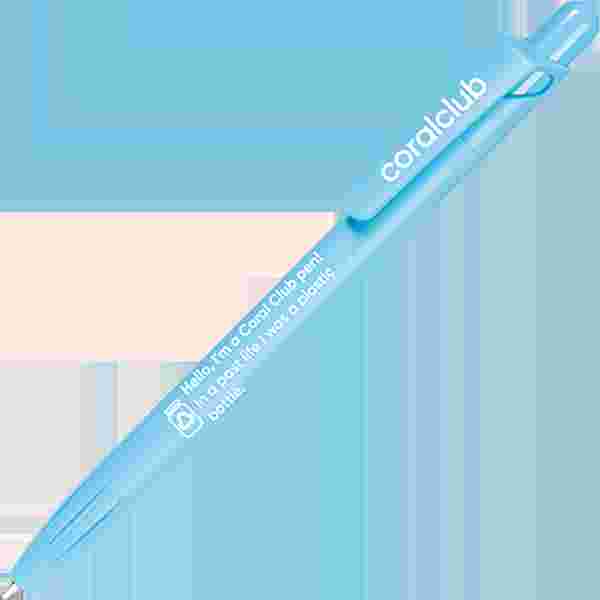 Pastapliiats nupumehhanismiga PET-RECYCLED materjalistс kirjaga "Tere, mina olen pastapliiats Coral Club! Eelmises elus olin plastikpurk".